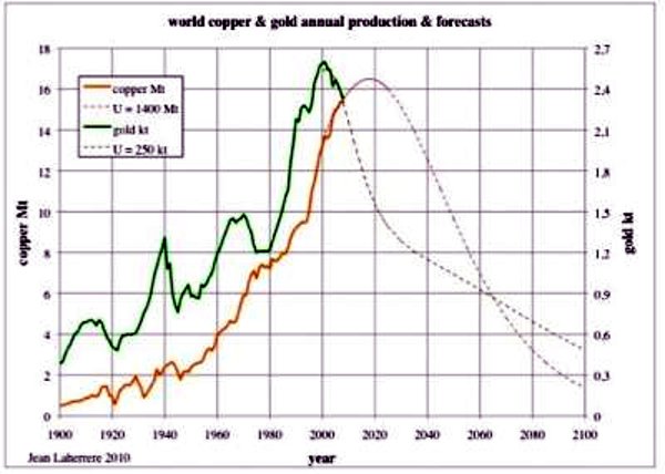Materias primas: Para producir 1 MW de electricidad hace falta 1 Tonelada de Cobre. Esto significa que si necesitamos más energía, también necesitamos más combustible y metales. Ergo, el crecimiento es imposible debido al agotamiento de las materias primas. No hablamos solo del pico del petróleo: Pico del oro, del cobre, del hierro, del uranio, de la plata, zinc, etc, etc...