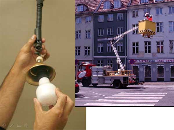 La imágen refleja la implantación progresiva del gigantismo- una grua para enroscar una bombilla. Operativamente necesario, pero que conceptualmente erróneo: al alejar las soluciones de la escala humana estas van quedando progresivamente en manos de aquellos que pueden costearlas, limitando nuestra creatividad y capacidad de utilizar los recursos disponibles en nuestro entorno inmediato con una relación esfuerzo-resultado adecuada.