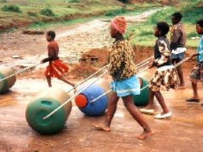 (Img: transporte de agua con bidones autoportantes.)